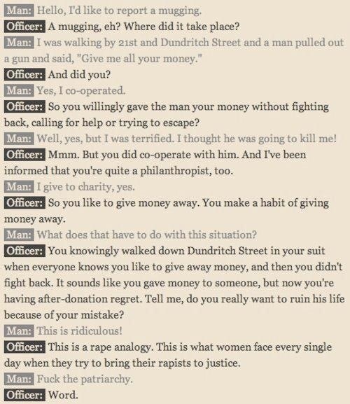 I found it an apt way to describe why people (mostly women) don’t report rape or sexual assault. but this special snowflake found it “selectively prejudicial” and interpreted all of this to mean that “any man in power” is to blame for rape culture.