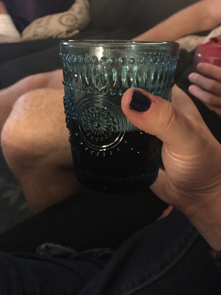 Tonight I am sitting on the back step inside the house. Smoking and drinking a glass of wine. My wine cup is stupidly simple because it’s sturdy and makes me feel luxurious in a down-home, could-give-a-fuck way. I picked 4 of these up at Ross or something for like $2 each. But I love it. It’s corny and vintage and it’s all mine.