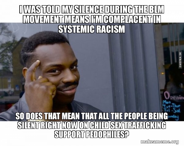 This was the blatant backlash of their white supremacy, jealous of not being the center of all things spiritual and feminine. This is a clear effort to use the power of their whiteness to punish black women, indeed any woman of color, for the audacity of turning the mirror on their complicity in these oppressive systems. They didn’t need Q to engage in this, it had been happening for time eternal, but Q made it easier for the message to spread and burrow deeper into their consciousness. In connecting BLM to a fantasy cabal of high-profile celebrity pedophiles, they effectively declared that anti-racism was directly funding child sex trafficking.