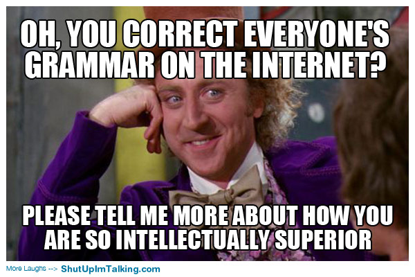 When we correct others’ grammar and spelling, particularly in an argument, it’s to position ourselves as superior to them. We’ll say “It’s ‘you’re’ not ‘your’, you stupid head” as if that’s the whole of the argument. Yet, all it communicates is that we think of ourselves as superior to the imperfection of grammar and spelling mistakes. Congrats, I guess?