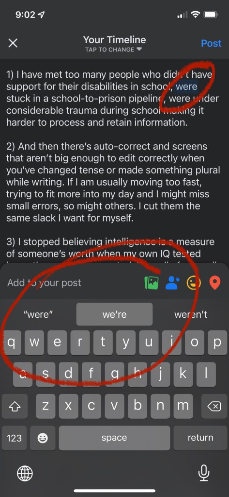 Most of the grammar errors we point out to our opponents online aren’t actually material to the meaning. I understood them well enough to correct the grammar in the first place, to know what they meant to say but didn’t have the words to match it. So when I clapped back with *their* I wasn’t actually responding to their point, which I correctly understood. I was trying to hurt their credibility. It wasn’t a kindness. It wasn’t a good-natured jest. It was elitist, classist, ableist nonsense.