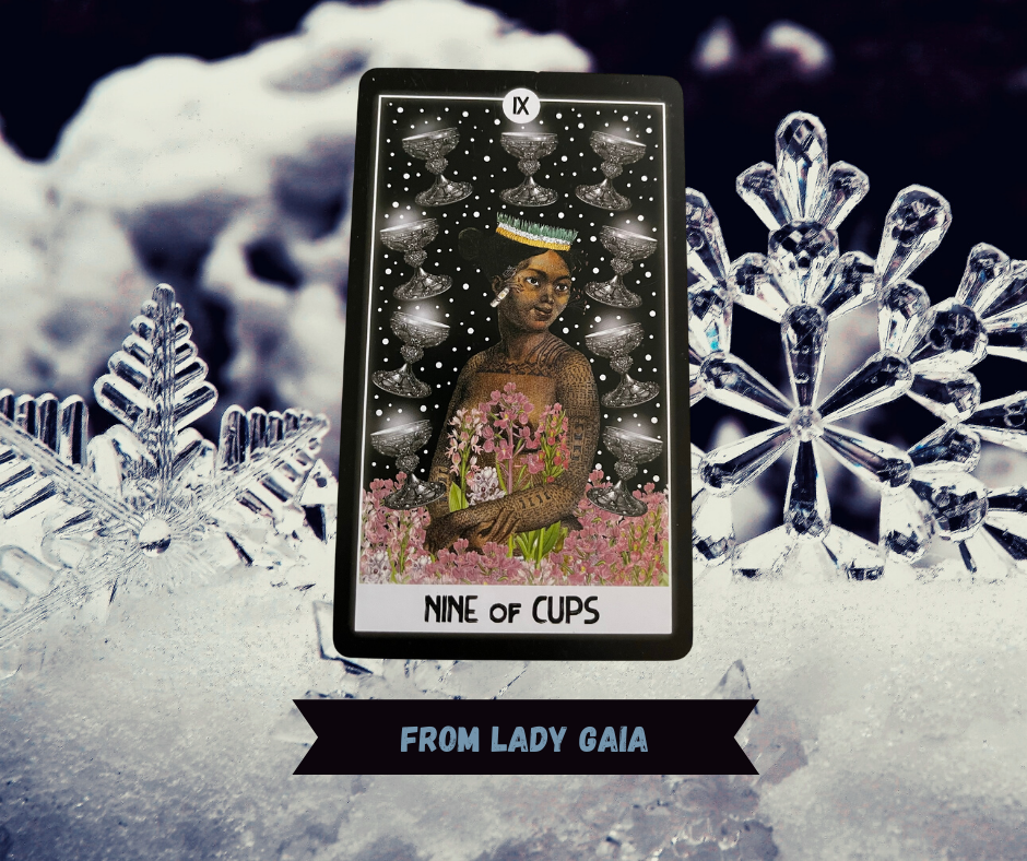 So, while I tried to listen to Lady Gaia last week, I still found myself overspending and panic shopping just a bit. And while that wasn’t my finest moment, it was short-lived and not nearly as damaging to me financially as it has been in the past. Because even if we can reduce the waste, we’re still doing better than we were. Here the Nine of cups blesses us with the abundance of a job well done. In exchange for our deep gratitude, Lady Gaia encourages us to look at how far we’ve come in the past year. Not just with our material abundance, our care for her, but our care for each other. What have we manifested that we didn’t think was possible before? What could we manifest in the coming year to build on these successes? to continue to improve? Maybe if we achieved our intention of growing a garden, maybe this year we can donate our excess produce to a food rescue organization that can help fill the bellies of our neighbors (a cause I personally am passionate about)? Or maybe this year we can donate $25/mo to a conservation organization or invest in reusable products. There is so much success we can build on. Which is your favorite?