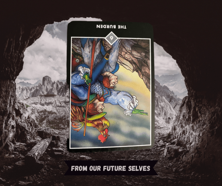 Our future selves assure us that we will no longer be carrying the burdens of others’ expectations on our shoulders. When we look at this card right side up we see a man struggling under the weight of a tyrant telling him where to go – pursuing his own agenda. Here, we’re climbing the mountain on our own – taking our own path, for our own reasons, and on our own terms. Our future selves remind us to detach from the expectations of others in order to reach new heights of our own. We cannot walk anyone else’s path for them, nor should we ever abdicate responsibility for walking our own. Let go of the karmic piggyback rides.