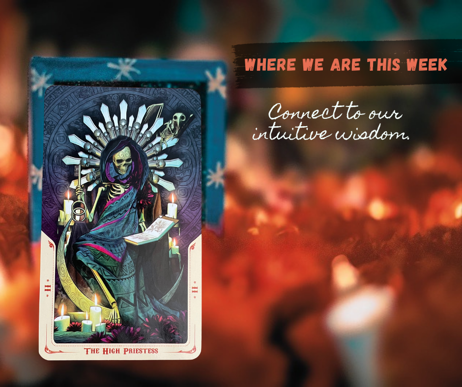 The High Priestess is a deliberate nod from the forces of Divine Love to honor the call we feel to our ancestors, to the rituals of Samhain and other shadow and portal work that comes with late harvest/early winter. Reclaim the wisdom of the rituals that come from your families of origin all the way through to your ancient bloodlines. This is not a time of restriction, but of great introspection, healing, and divine rest. Follow the rituals that most align with the highest truths of the cosmos and the deepest respect for Mother Earth. When we tap into our deep wells of intuitive faith and wisdom we can do literally anything!