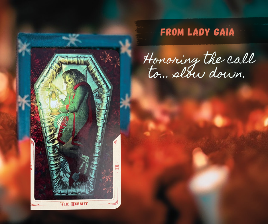 Normally this time of year might be difficult for me with trauma anniversaries, seasonal affect disorder and way too many social engagements. But this week’s reading with the Santa Muerte tarot galvanizes me for what comes next. It is a massive splash of truth that combines the energy of our natural selves, recognizing and honoring earth’s rhythms without shooting ourselves in the foot out of our own addiction to action, turmoil and catastrophe.