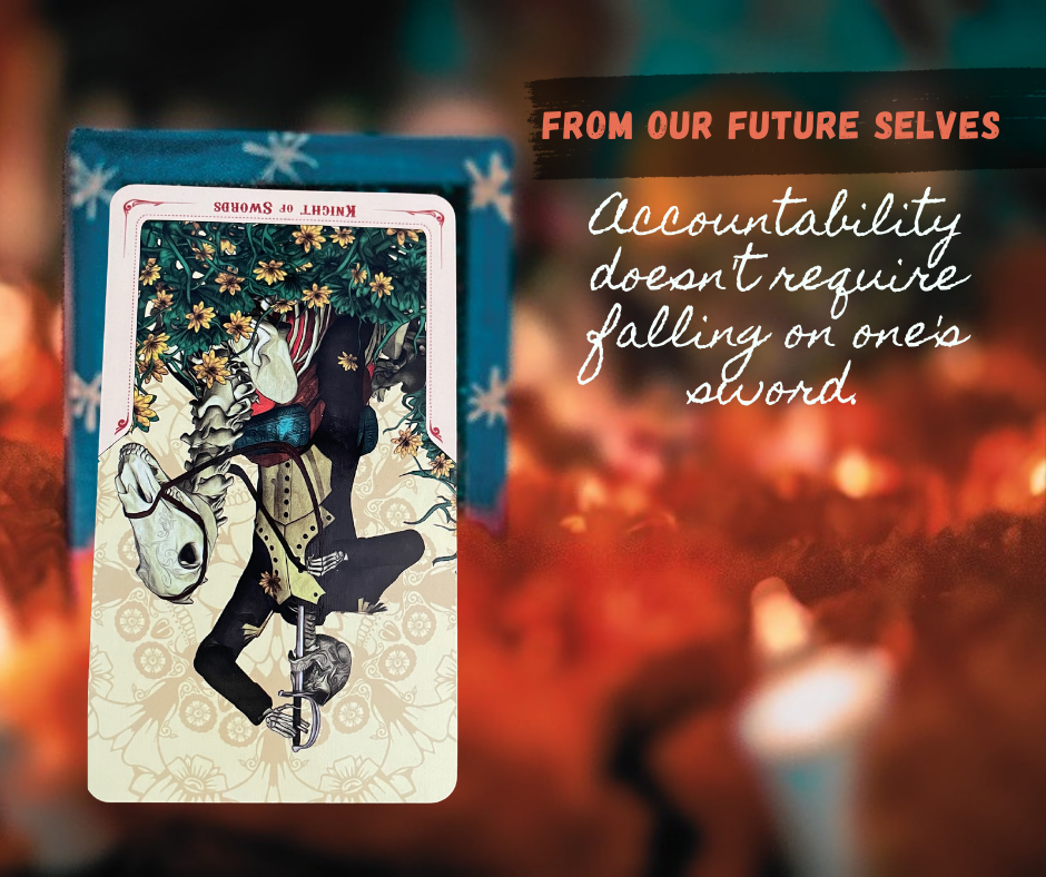 There is perhaps no one who is more familiar with the mental self-defeat-as-noble-sacrifice level of accountability than me. Whenever I’m in crisis, I often look for what I did wrong, blaming myself for the whole problem, even if it was only 1% my fault. We have reached a point in society where we understand that accountability is a good thing, but we misassign responsibility. Either we are demanding that people fall on their swords to satisfy or it is being asked of us. Either way, it is counterproductive to the world we need – for love doesn’t demand we expire to prove ourselves, but rather that we persevere and sincerely integrate the lessons. Look at where we are demanding punishment instead of accountability. Is the ultimate sacrifice really what’s needed or can we just….DO better?