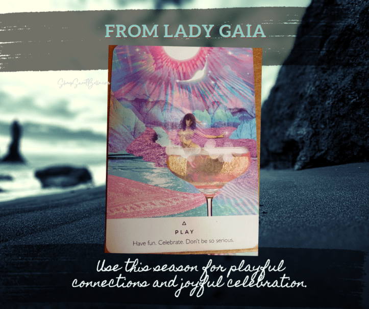 I’m starting to find that the energy I feel from Lady Gaia, Mother Earth is eternally forgiving if tinged with a growing impatience for our ignorance. After scolding us last week for our waste and disregard for her gifts, we are invited to indulge in gifts of a different sort – the playful companionship of one another. This is a social season and while we all still need to take precautions, many of us feel comfortable with at least a small gathering of loved ones to celebrate and make merry. This week Lady Gaia wants us to engage in the sparkly play-making of the holiday season, to engage in celebration and rejoice in our connections. There is power in this too.
