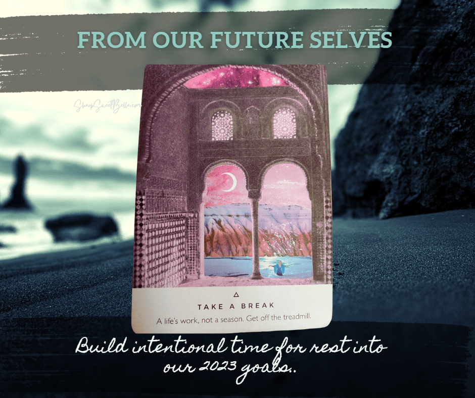 There are a lot of different ways to interpret this card. It can be a current imperative from our Future Selves to take a break now in order to support our oncoming work. Or we can see it as strategic advice for our future success. Fine nuances delivered with a commanding sledgehammer. Elsewhere in the reading, we hear the themes of deep rest reverberate. So, our Future Selves, are telling us to get used to building in periods of rest through our daily, weekly, monthly, and seasonal lives. Whether it be for our ultimate health and well-being, or a deliberate attempt to reduce the anxiety of the world by slowing down, this needs to be one of our individual and collective goals in 2023 – we all need a break. Vacations for all!?