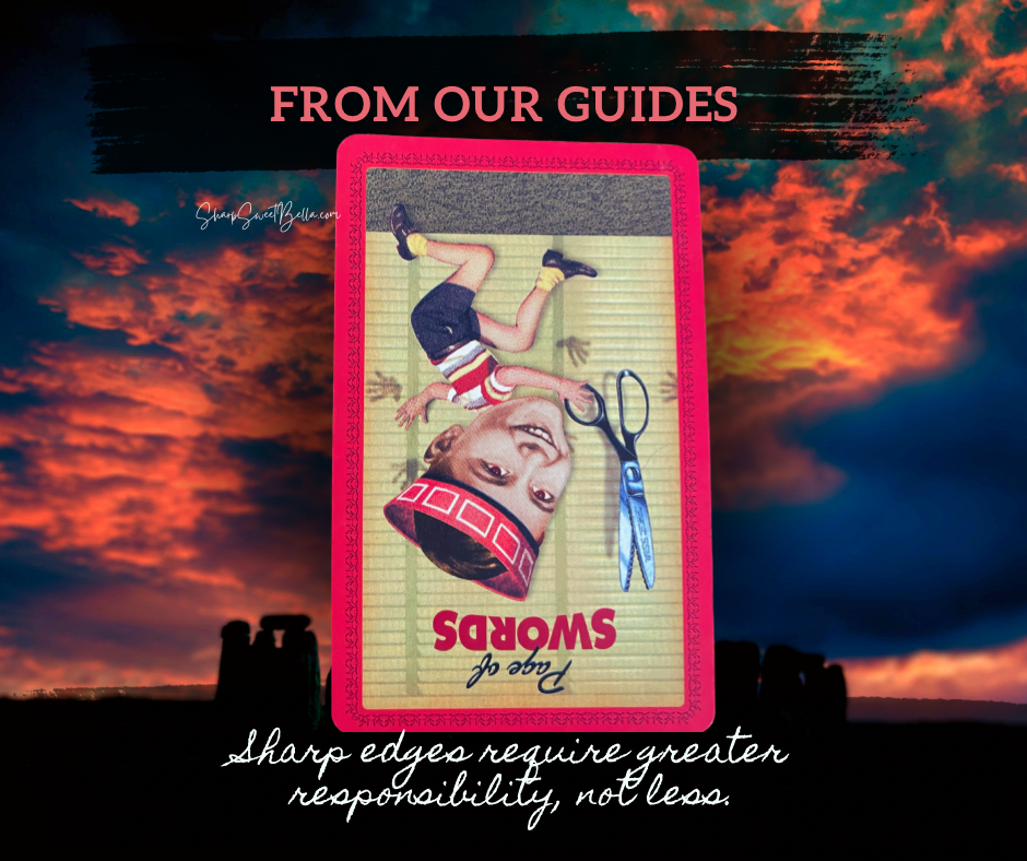 I always have trouble with the Pages, partly because of the way I was trained in Tarot, I’ve been taught to view it as “younger” energy, more about communication than action, like the town crier shouting the good news. Today I view them more like interns – eager, ready to work, the banner bearer for my cause. Here, the Page of Swords thinks he’s helping by running around with scissors, snipping at every string of connection he finds. He’s like the mystic gurus who all “disconnected” themselves from humanity’s collective and led their followers into believing that Trump and the Insurrection were good things. The world is sharp and so he wants to clap back but only hurts others in the process. The sharp edges of the world require our care, not our reckless reactions. We need more sweet and less sharp.