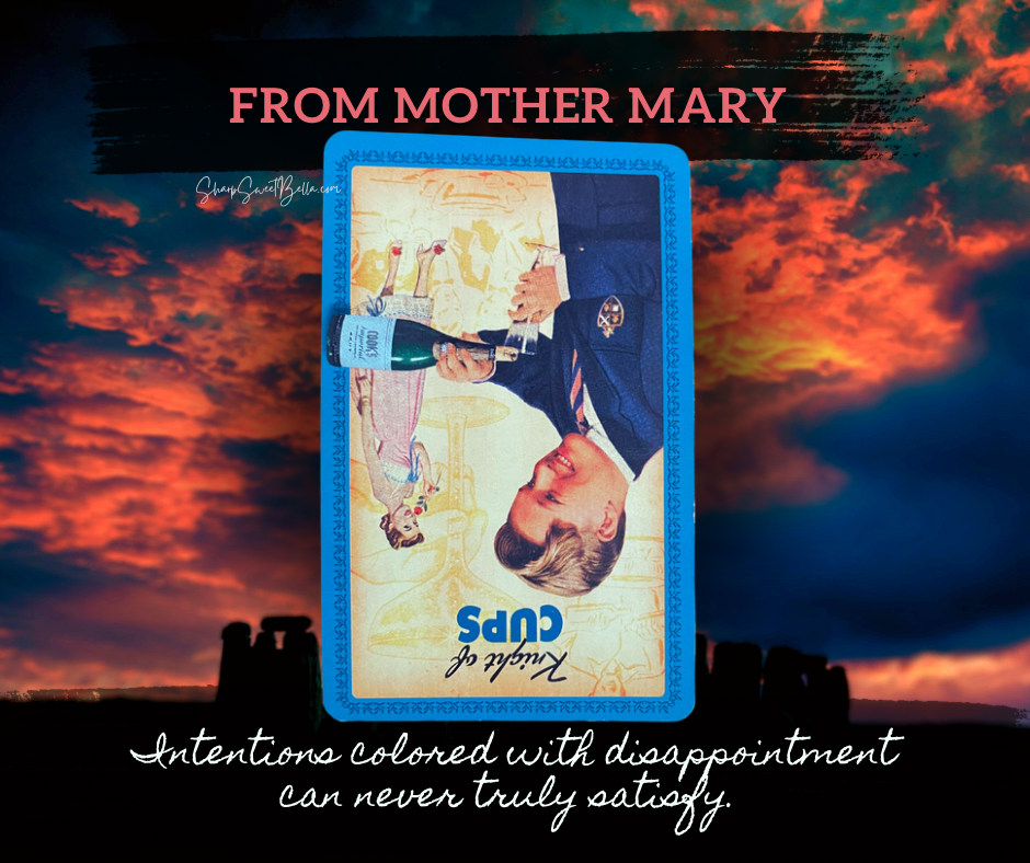 Who else had to take a bit of a leap of faith with the card above to believe that new love is coming into our lives? And as usual, arriving with the cheeky, sarcastic reminder is Mother Mary reminding us that often we are poisoning our hopes with our anticipated disappointment. By deciding ahead of time who is and isn’t worth our attention, and by smashing sour grapes during the first few dates, we are poisoning the well, signaling to the universe that we’re going to find a way to keep ourselves lonely. Intentions that are imbued with the bitter taste of disappointment will consistently always fail to deliver. We cannot expect good things to come of our unresolved anger, passive-aggressive resentments, or formulaic pick-up lines. We have to stop poisoning our hearts against love.