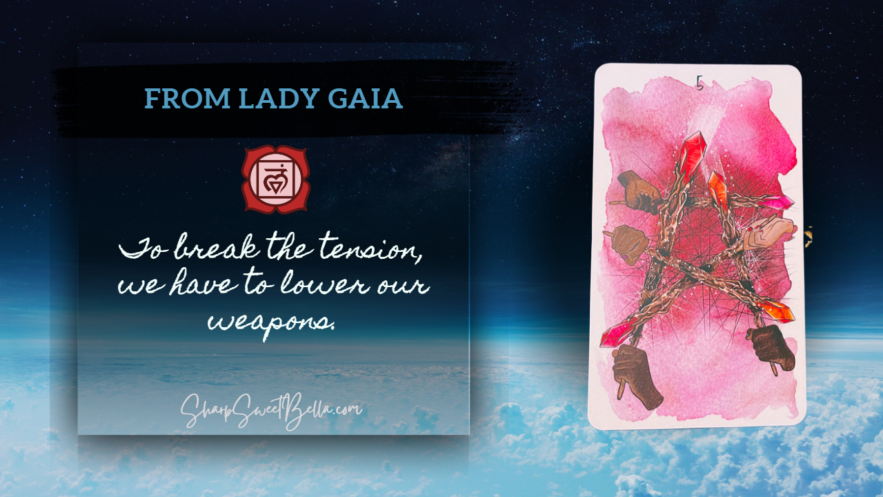 There is a tension that is driving through our world right now. Things that once were helpful are now holding us back. Our need to support ourselves financially stands in conflict with our highest selves. We’re fighting not just a battle within, but we see the inherent tensions of the world threatening to snap at any provocation. While this card acknowledges the inherent difficulty surrounding us, all year, this position has been invested in action – and here we’re being invited to be the ones to either put our weapons down or come through and bring awareness to the inherent discord – for only in voicing it and bringing awareness to it, can we come up with a cooperative, rather than the competitive solution.