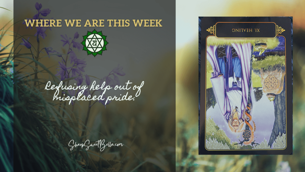 This is not a traditional tarot card, one of the additions to the deck that make this both so rich and peculiar to work with. Here this card inserts itself front and center to call out our resistance to healing. We have been offered help, offered guidance, and given signs and answers, but we are still holding onto pain as an identity, our individualistic suffering as penance. We push away help, either because we feel we’re undeserving or because we think it earns us cosmic brownie points by doing things all by ourselves. Both of these ideas are rooted in fear – fear of being a burden, fear of not being enough – both driven by an overwhelming paradigm of systemic harms that keep us separated from each other. It is time to let go of the false pride and finally ask for and accept the offered help – it is there waiting for us!