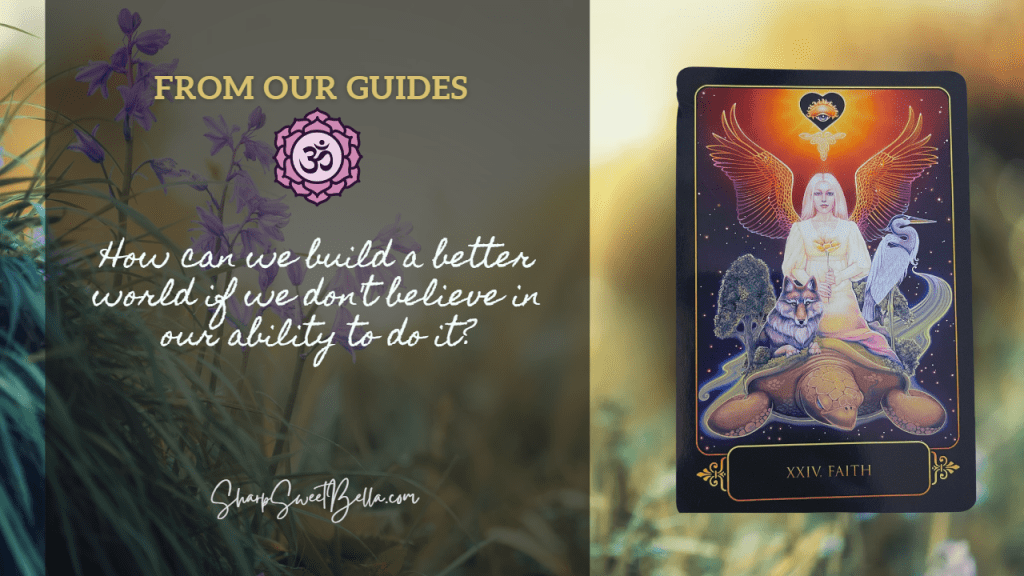 Our guides are showing up to remind us to have faith in ourselves. They are cheering us on, giving us wings to fly. The symbolism in this card speaks to a larger faith that connects humanity – a groundedness in the earth, a manifestation of abundance that flows with the seasons, in alignment with nature. It is a truth that could unite all of us if we just heed the messages we’ve been getting from Mother Earth inviting us back home to her embrace. However, none of that is possible if we don’t have faith. If we don’t believe we can create this world then we’ve already determined our fate. When we trust ourselves enough to try, we’ll find more true believers who want to connect. The message here is clear – have faith in yourself and in those who offer their support, including your guides and ancestors. So many people believe in us – isn’t it time that we do too?