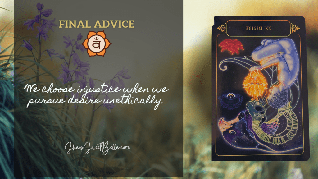 The message here is two-fold – a) honestly assess your desires and whether you are creating more destruction and harm just to get what you want and b) stop worrying so much about what anyone else wants or desires and work more on pursuing the desires that will bring joy to more than just you. There is an inherent disharmony with how the world prioritizes “me, me, me” when we need to be thinking about what will bring the most peace and joy to “we”. Think about what may be missing in the emotional integrity within to make people justify reckless excess in a world where so many are already suffering. What kind of empty husk might someone have in place of their heart to willingly exclude, shame, and threaten others out of mere desire? Deconstruct the narratives of power that lead so many to desire such reckless imbalance and unrestrained sophistry.