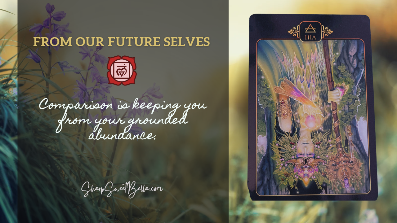 One of my favorite shows is Brittania. This card reminds so much of one o the druid characters, Devis when he or his apprentices are not getting the point of something. A strong thunk to the head to drive home the point. Here, we’re being thwacked with a stick whenever we start comparing ourselves to others. It doesn’t matter what others have – it’s never what it seems anyway. Nor does it matter what others do with their lives so long as it doesn’t interfere with others’ right to live, it doesn’t have to worry us. Our future selves are concerned because the more we get stuck in comparisons, the less we are focused on building a world that doesn’t need them. How about keeping our eyes on our own work, our own blessings instead of constantly trying to copy and covet the work of others? Never mind cancel culture, it’s comparison culture that’s been bleeding us dry one jealous, bitter, self-inflicted cut at a time.