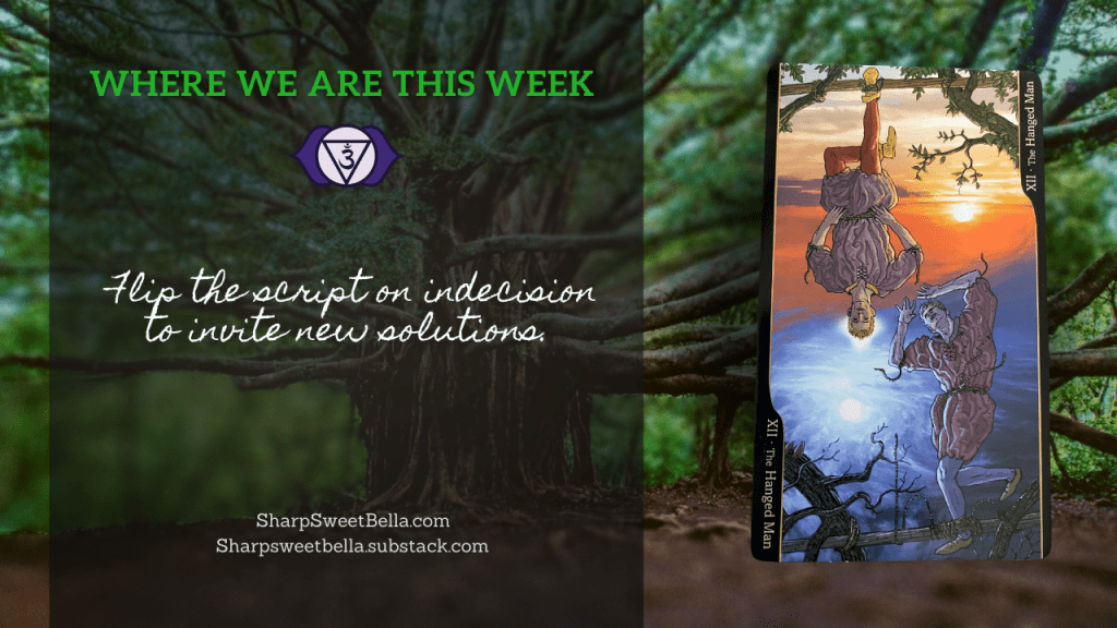 Interesting that last week we had the Sun, illuminating our “outta f***s to give” kind of freedom-loving attitude and now we follow it with another major card, The Hanged Man. The smiling, serene face, as this man hangs from his foot on the tree of life, can hit like a disturbing but almost mildly ambivalent awareness of the precarious position he is in. What matters here is that whether he put himself there or has simply accepted his fate, he simply sees the world differently than we, his audience, do. How many times do we twist ourselves in knots trying to conform to what everyone says we should be? The lesson for us is that instead of judging where we’re at, whether we’re conforming to everyone else’s reality of who they want us to be, we can flip the script to find acceptance and indeed, freedom in how different our worldview is. When we stop trying to apply everyone else’s solution or judgment, we can see things the “right way around” to arrive at the solution that makes the most sense for who we really are.