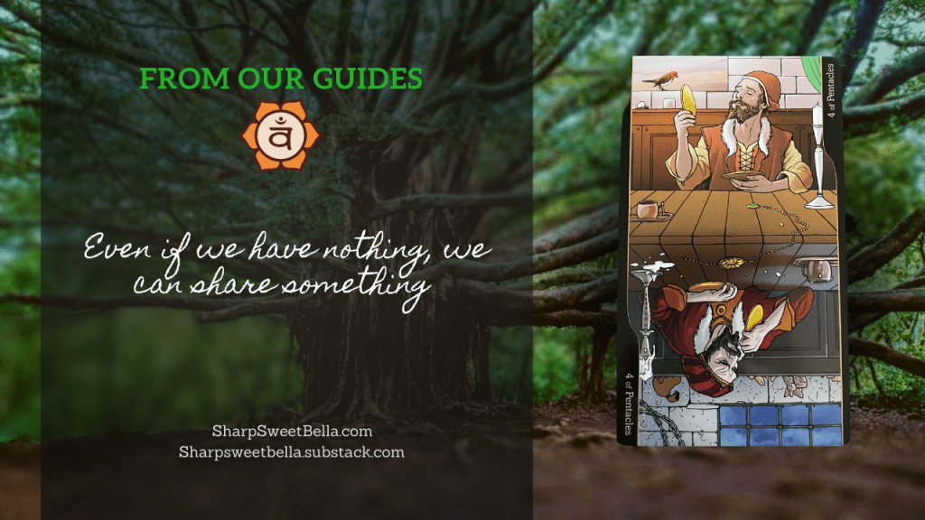 Last week’s standstill for some of our plans was meant to bring forth a valuable understanding of scarcity & lack embedded in this week’s card. The four pentacles upright speaks to possessiveness and greed, but also safeguarding one’s treasures (whether they be people, places, things, or talents). Fear drives the hoarding of resources; when one is feeling secure, they feel more free to share theirs. However, the Guides here tell us that instead of waiting for a “safer” environment, more financial security, or some vague idea of success – that in sharing what we can now, we create a network of support that itself creates the safety we need in the form of collective care. Remember, we can all support each other…and it doesn’t always have to be financial, just our presence can be enough.
