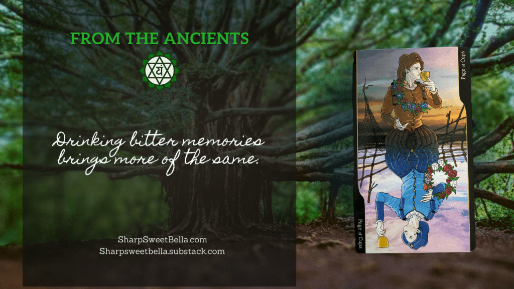 Pay particular attention to both of the Pages in the reading this week. When I teach tarot, I usually view the pages as the “interns” of the court cards – full of energy, opinions, loyalty, and ambitious gratitude. One of the overwhelming messages that came through with these two troublemakers is that we keep drinking bitter, sour memories and spitting that back out at the world like acid, disintegrating the good we have around us. The thin line of these memories can make the difference between the best and the worst of ourselves.