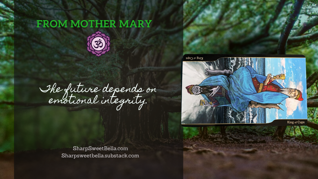This week I chose to give you the card from this position as it shows up in the readings themselves – sideways. See, Mother Mary, my patroness, is the example I have for being a bridge between humanity and the divine. Here, the pains of our past and the potential of our future selves. The natural intercessor, she points to the crucial turning point we face in our quest: our commitment to emotional integrity. The King of Cups represents not just emotional control and mastery, but also transparency and compassion. Do we have the courage and strength to embrace our own vulnerability, to let go our our grudges in order to meet people where they are? Do we have the mastery to listen for honesty and to forgive when redemption is possible? Everything that we choose right now is like a switch – we can either choose integrity or disparity, but we can no longer sit on the sidelines. Our choices and the stories we tell about the past will be a crucial part of how our future plays out.