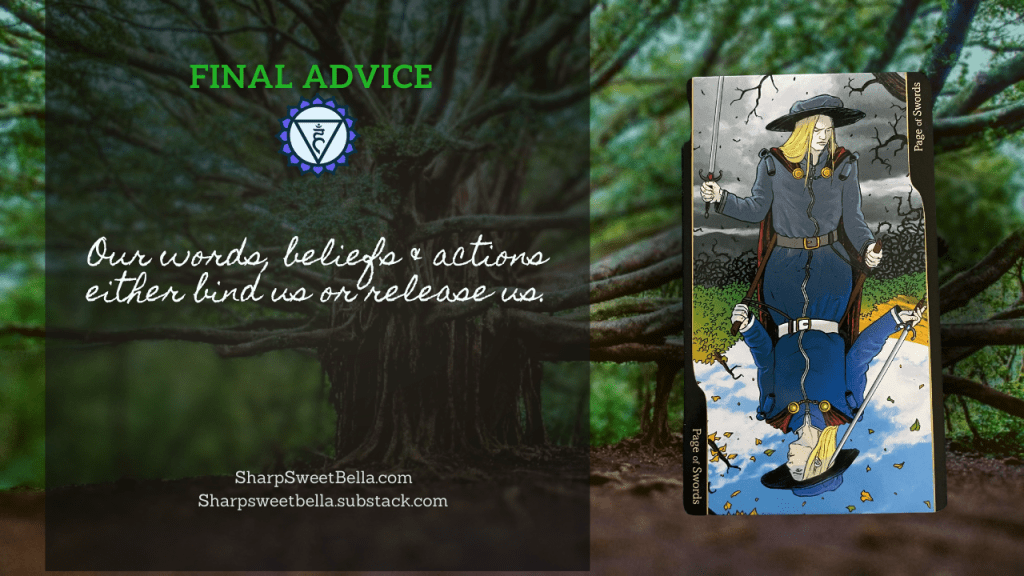 Last week we had a brush with the Page of Swords reversed from the ancestors, warning about taking the role of moral hall monitor too seriously. This week we have a similar warning in the outcome, except now, we’ve been drinking so much of the bitter memory brew that now we’re activating everyone else, spitting acid on the precious things we prioritize. Even if we cannot control how we think about the past, we can certainly change how we talk about the future and how we act in the present. When tempted to pass on the pain to others, remember that we are here to create something new, to stop reaching for the easy judgment and snarky snap impressions, and instead choose to contribute something better, not bitter, into the world.