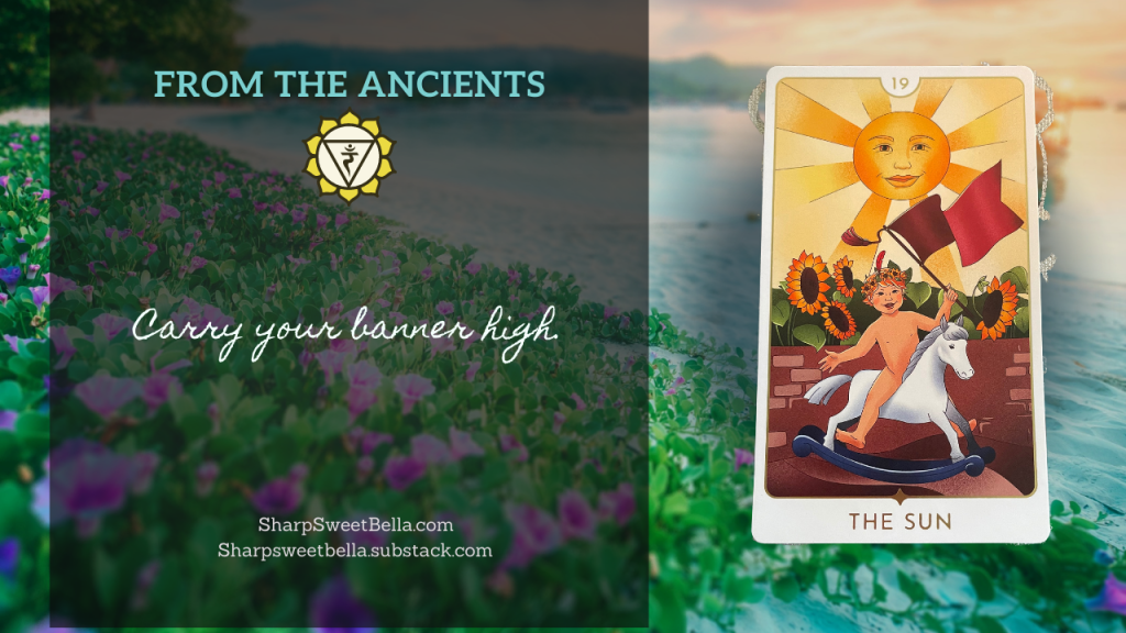 Another solar plexus message from the ancients and ancestors. Remember last week’s message was about having the courage to show up as ourselves, especially knowing that some of those who came before us were prevented or punished for being their authentic selves. Because we are entering an era where we must shine brightly to lead humanity out of its self-destructive, overconsumption of its essential resources, we are urged to carry our banner with pride. Yes, we carry the banners of our ancestors, but they want you to know that they are carrying YOURS more than the ones they created themselves. They want you to keep the symbols and traditions that support you, but to also add your own because the choices you make now create the pathways that future generations will have to tread. Be intentional and live with purpose.