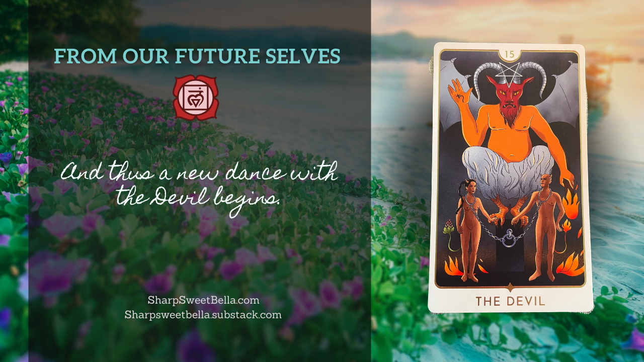 I know…it’s frustrating that we just broke free of one mental prison, but now we have the Devil card already taunting us from the future – showing us a humanity that is chained to its poor choices – or rather its poor motivations. It might feel like a step backward, but the Devil always shows up to show us the illusions we tether ourselves to – the bypassing and denial. Notice always who tries to blame the devil or some other scapegoat for the suffering they caused. We are entering a time of radical transparency and many would rather cling to their illusions of innocence than break free of the habits and beliefs that give them an excuse to be rotten. It will be their choices (and some of ours) that give rise to a new illuminator of the painful collective truths.