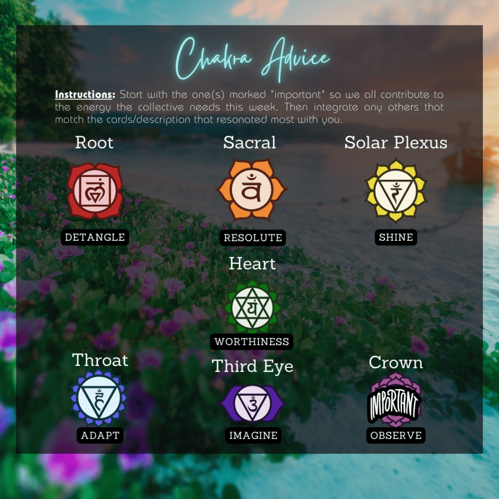 This is normally a card that means “off to new shores”, leaving behind conflict and woe, but here, I feel like our inner children are still clinging to a hope that is far-fetched and risky. Like going back to a war-torn village to find a child’s stuffed animal, the risk of leaving it behind still weighs more heavily than the risk of moving forward without it. We keep getting dragged back into the drama of our physical realities trying to pursue dreams that could cut us down if we linger too long. Notice which creature comforts and habits are drawing us back into an old version of ourselves.