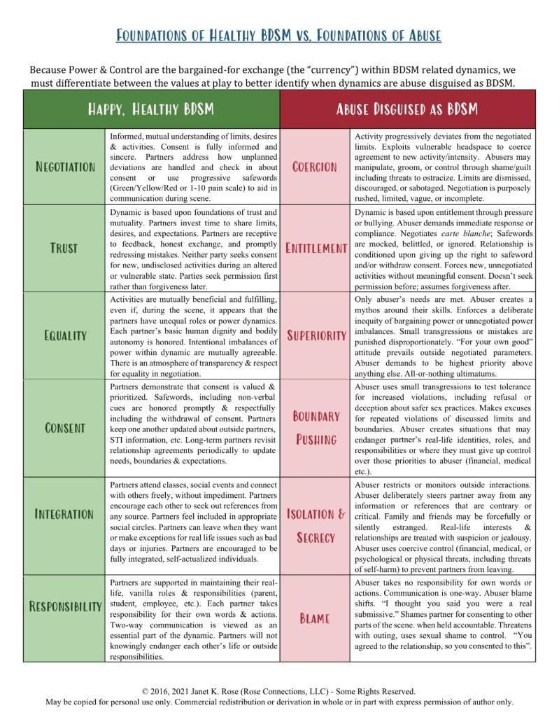 I often refer to the “currency” of BDSM as power & control. That is the “bargained for” exchange. It is an intentional way to connect the dots for attorneys and advocates who are the gatekeepers of justice/resources related to intimate partner violence (IPV). Having been trained as both, I became intimately aware of how the tools that describe IPV per se demonize what happens on BDSM relationships, which catches good relationships and paints over the bad ones. By focusing the entirety of the evaluation on “power & control” consensual power exchange play often gets painted with the wide brush of “abuse” without the nuance of how abuse does and doesn’t happen in our community.