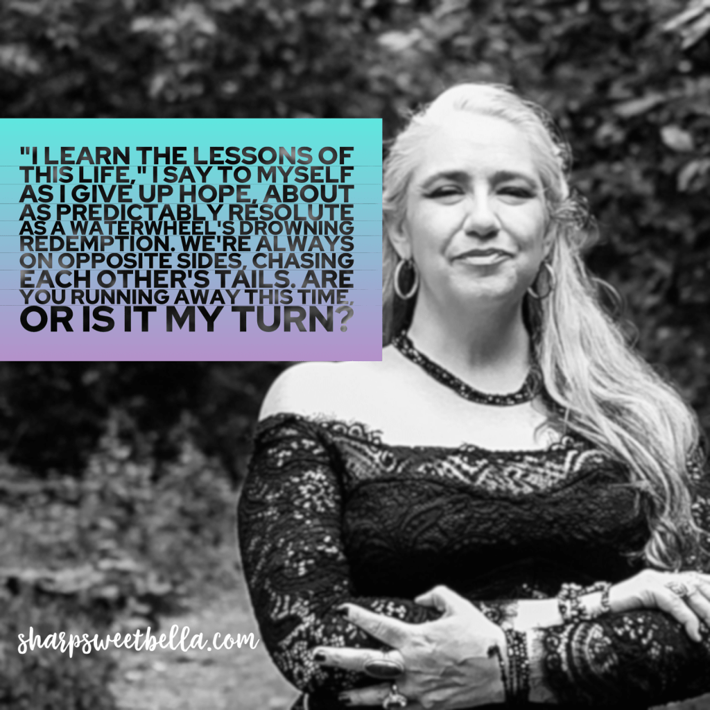 “I learn the lessons of this life,” I say to myself as I give up hope, about as predictably resolute as a waterwheel’s drowning redemption. We’re always on opposite sides, chasing each other’s tails. Are you running away this time, or is it my turn? Fickle gratitude to the universe for teaching us about patience as we sink further into the cycle until we’re just standing still, at the center, backs to each other refusing to move forward and claim our desire.
