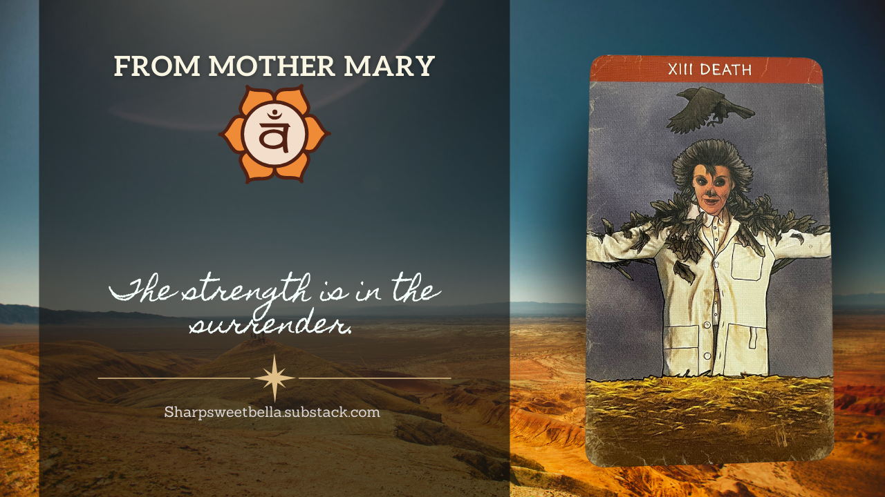 The same card is in the same place as last week. Then I said, “This card means that we are already stepping into the roles we are being called to. We have been preparing for these roles of compassionate, collective leadership. There is nothing left to get ready for – this transition is imminent.” So, not only is this card saying “Ahem, I said what I said…” with this next card from Mother Mary it is a callback to this quote from the Messages in November [https://sharpsweetbella.substack.com/p/rise-of-the-nurturing-leader-messages]: