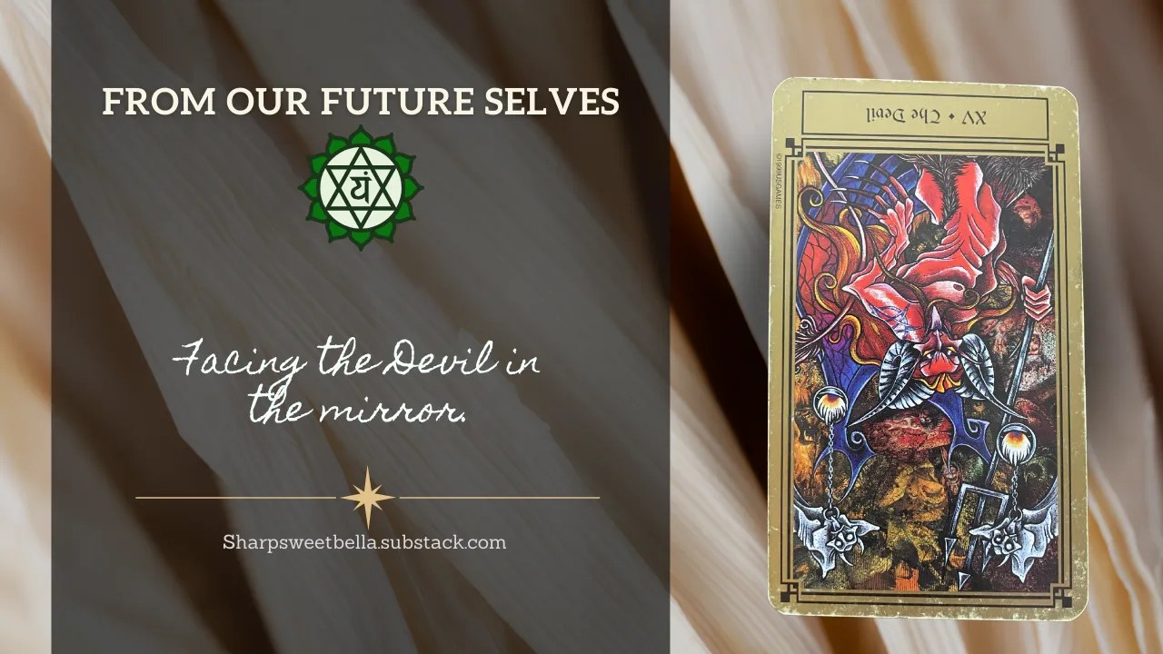 Last week I wrote: The judgment card is here to put the gaze straight on you – to hold you accountable for this piece of the world’s soul that’s been entrusted to you. A lot of us did a deep dive and discovered wounded parts of ourselves that have been inflicting their judgment, telling us that we can’t/shouldn’t (the two most powerful curse words that society uses against us). This has finally revealed the shadow parts of ourselves that we can no longer hide from, the parts that need to be integrated into the whole. This week, the message from the future selves is the use this eclipse energy to find the strength to look ourselves in the mirror, to let go of the shards of hurt that keep bringing out the worst in us, and to allow ourselves to make peace with the devil within.