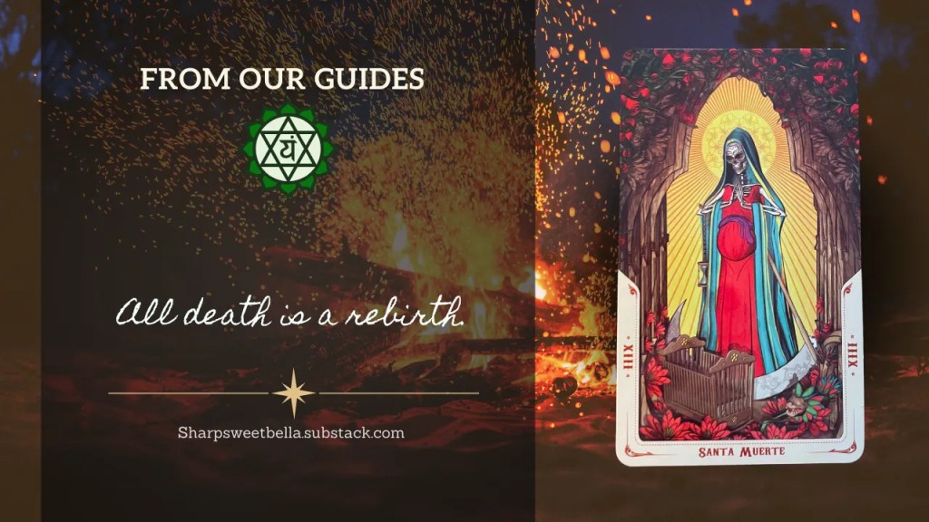 I admit, I was in a pretty disillusioned state when I chose the deck for this week’s reading. I rarely reach for the Santa Muerte Tarot except when I want to hear from my ancestors. It had been a rough week of ups and downs, hard work confronting old demons and once abundant blessings falling into silence in my wake.