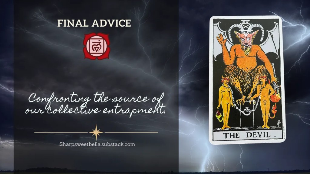Full disclosure: despite my Catholic upbringing don’t believe in Evil. I don’t believe there is a Devil. I believe humanity has constructed numerous scapegoats to get away with justifying the evil inside of us – the evil that comes bubbling up from jealousy, fear, and separation. Ordinarily, I interpret the Devil card as “the devil within” but right now we need to look at the players and systems that have been tying us down. It is especially worth looking at those entities that benefit from our collective co-dependent relationship with capitalism, greed, scarcity, and control. We are all waking up to how we’ve enabled “the devil” to keep us locked in ignorance as if it were a virtue.