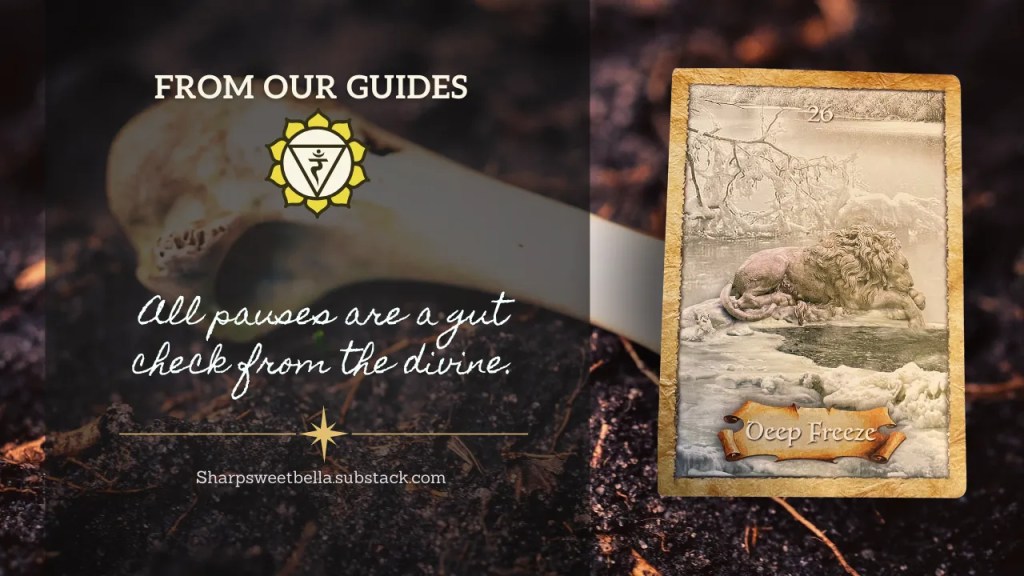It’s time to slow your roll just a little, friends. Despite the “deep freeze” listed here, think of this as a temporary reprieve to get your own house in order. Part of what we’re finding is what triggers us to go into a “freeze” response. For me, attention from a LOT of people will do it to me. Yet, if I want this newsletter to grow, if I want my message to spread, somehow, somehow I will have to be okay with getting attention, right? So the message this week is to take this pause as a sign that you need to unwind the cords of distortion from your body so that you can receive the great things that you’re planning to do.